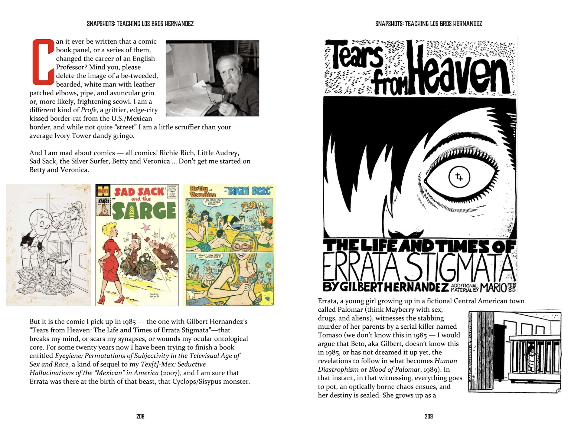SNAPSHOTS: TEACHING LOS BROS HERNANDEZ edited by William Nericcio & Frederick Aldama Amatl Comix, a San Diego State University Press Imprint date: September 16, 2025 Language: English Print length: 275 pages ISBN-10: 1938537572 ISBN-13: 978-1938537578 Dimensions: 10 x 7 x 1 inches $27.95 USA International customers, please use ourAmazon.com link. They will attach egregious charges (of course) but we will reimburse you any overage charges Amazon may pile on!... ... or sidestep Jeff Bezos's book mega-shoppeand pay only $28 -- shipping included -- by buying direct from SDSU Press! Hit the "Add to Cart"button and enter the credit card of your choice. DOMESTIC USA ORDERS ONLY! NO INTERNATIONAL The early reviews are IN ... ![]() ![]()